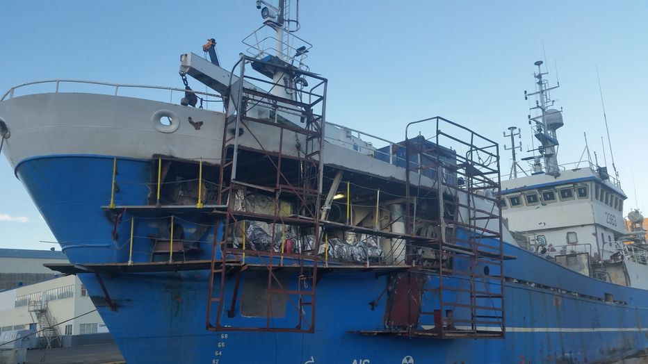 var þá verið að gera við tjón sem varð á skipinu þegar að togarinn Jón Vídalín VE bakkaði á Kap VE í Vestmannaeyjum í sumar. skemmdir voru á skipinu annarsvega bakborðsmeginn þar sem að togarinn bakkaði á Kap og hinsvegar stjórnborðsmeginn þegar að Kap slóst í bryggjuna þegar að Jón Vídalín VE bakkaði á hann,